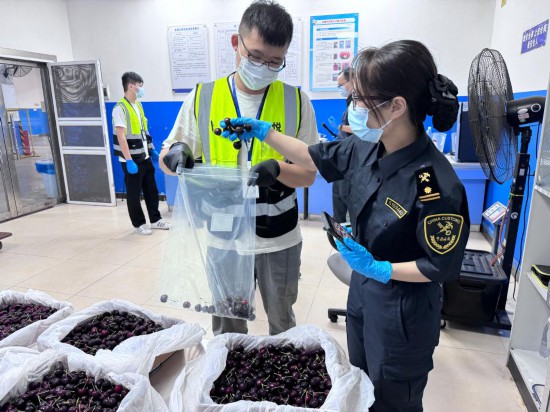 广州白云机场海关关员对新产季进口车厘子进行监管。(受访者供图)